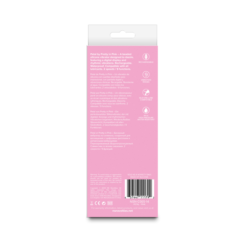 Petal by Pretty in Pink – A beaded silicone vibrator designed to dazzle, featuring a digital display and rhythmic vibrations. Rechargeable. Waterproof. Compatible with all lubricants. 2 speeds / 9 functions.